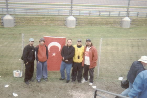 AMERIKANIN ARABA YARISLARI MERKEZI INDIANAPOLIS TE ILK KEZ DUZENLENEN AVRUPA ARABA YARISI FORMULA ONE A TURK SURUCU OLMAMASINA RAGMEN BIRAZCIK OLSUN TURKIYE REKLAMI YAPMAK ICIN (COK DA IYI YAPTIM)SERINA ILE GITTIK.SABAH 8'DE YERIMIZI ALMAK ICIN PISTTEKI YERIMIZDE HIC DURMADAN YAGAN YAGMURUN VE SOGUGUN ALTINDA SAAT 12.30 A KADAR BEKLEYIP 1 SAAT BILE SURMEYEN YARISI SEYREDIP TURK BAYRAGINI DALGALANDIRIP KENDI ULKELERINI DESTEK ICIN GELMIS OLAN INGILIZ,IRLANDALI,ALMAN VE ITALYANLARIDA OLDUKCA KIZDIRDIK!!HATTA BIR IKI INGILIZ VE YUNANLI ILE OLAYIMIZ BILE OLDU, AMA OLSUN DEYDI.. GELECEK YILKI BILETIM SIMDIDEN GELDI BILE ,BU YILDA EYLUL SONUNDA YAPILACAK VE BEN ORAYA GIDIP GENE TURKIYEYI VE TURKLERI TEMSIL EDECEGIM.UMARIM BURADAKI RESIMLER BIRAZ OLSUN SIZI YARIS HAVASINA SOKAR! *YARISI FERRARI TAKIMI SURUCUSU "MICHAEL SCHUMACHER " KAZANDI!
